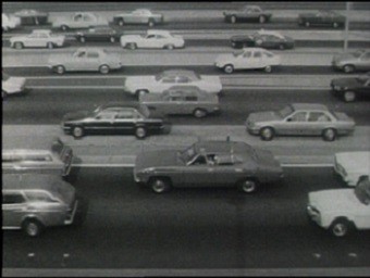 In making the case for dramatically increased investment in public transport the camera provides aerial footage of vast expanses of an imposing Riverside Expressway and of traffic congestion on the Victoria Bridge. It then demonstrates how the Northern Freeway plan will take out ninety additional houses in working class localities in order to skirt the property occupied by the Queensland Newspapers Group, publishers of The Courier Mail. The documentary also includes a memorable close up interview with Main Roads Minister Russ Hinze in which he crystallises the polarised positions for and against public transport investment, describing members of the Brisbane Freeway Protest and Compensation Committee as “a pain in the neck” and as “fairies” who don’t live in the real world.