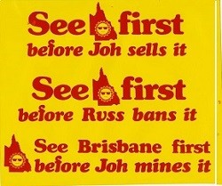 - See Queensland first before Joh sells it. See Queensland first before Russ bans it. See Brisbane first before Joh mines it. / Australian Labor Party. Queensland Branch 1977