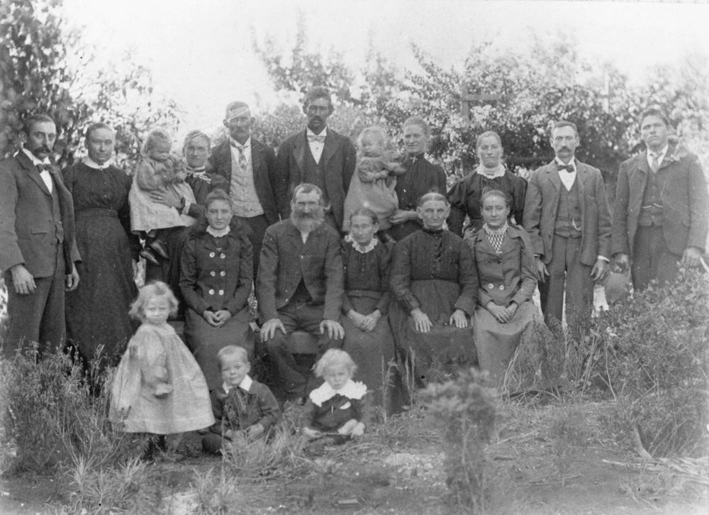 Wedding guests and bridal party at a German wedding, Ropeley ca. 1905. The bride was Miss Johanna Nauman, daughter of Mrs. M. Nauman, of Warwick, and the bridegroom Mr. Leopold Schultz, son of Mr. Charles Schultz, a farmer of Ropeley, near Gatton. John Oxley Library, State Library of Queensland. Neg 96063