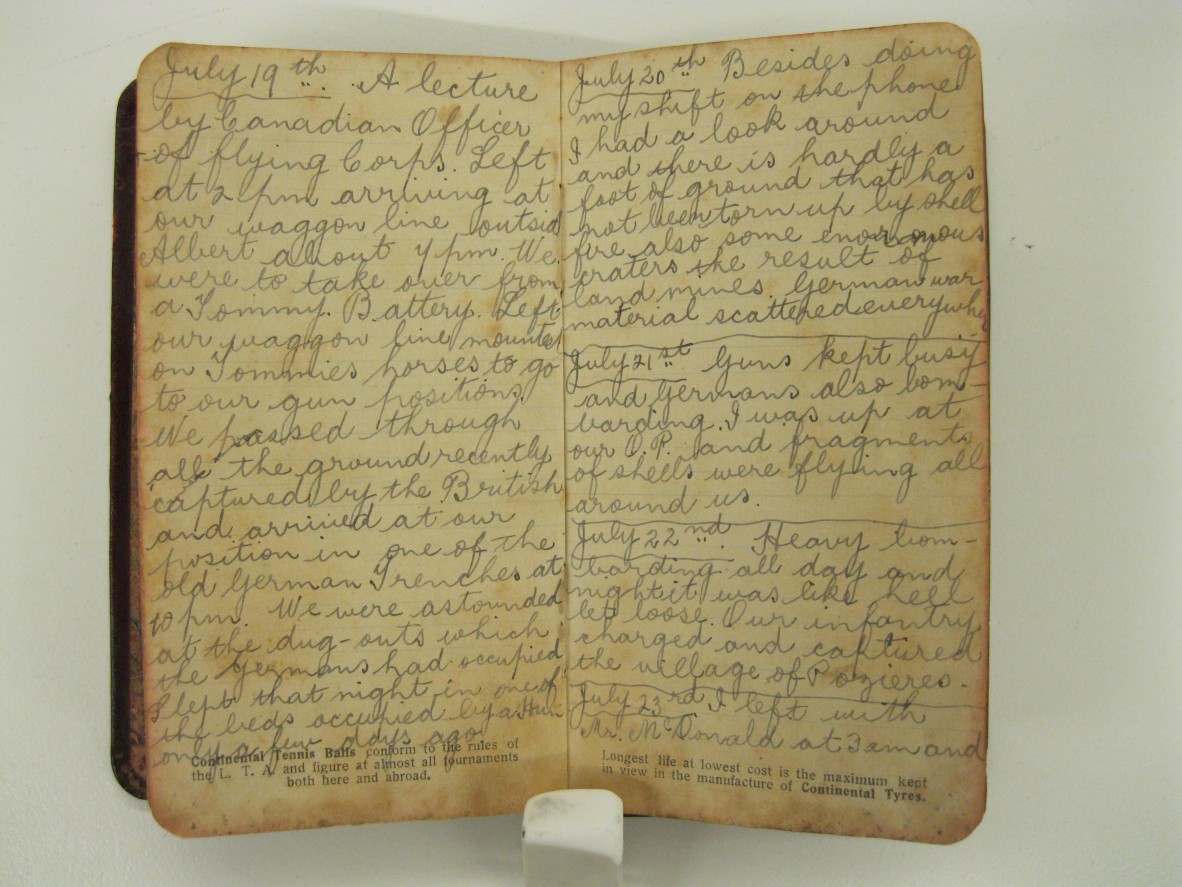 The two small diaries cover the period January 1916 to September 1917 and detail his journey from Australia to Egypt and active service on the front lines in France and Belgium. The entries in late July 1916 cover the Battle of Pozieres and are truly harrowing: