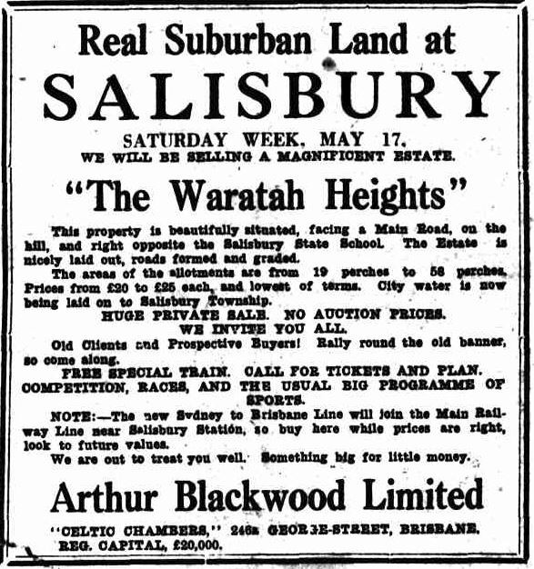 "Arthur Blackwood Ltd, report that they had a very successful sale last Saturday at Salisbury, "Waratah Heights Estate", a special train conveying the people to the land. After the disposal of allotments by private sale, sports, races and competitions took place, which greatly interested the big crowd attending. Salisbury being only a few miles from town, is an ideal suburb with many advantages, having school, stores, and public hall, and also city water being laid on to the district." (The Truth, May 25, 1924, p.16)