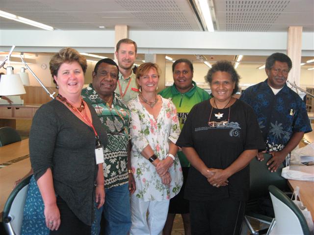 - From left Louise Denoon, Manager Heritage Collections, Mr Thomas Sebasio, Simon Farley, Manager, Client Services, Heritage Collections, Lynette Griffith (front), project coordinator from Erub Erwer Meta, Louise Anson, coordinator of Darnley IKC, Flor