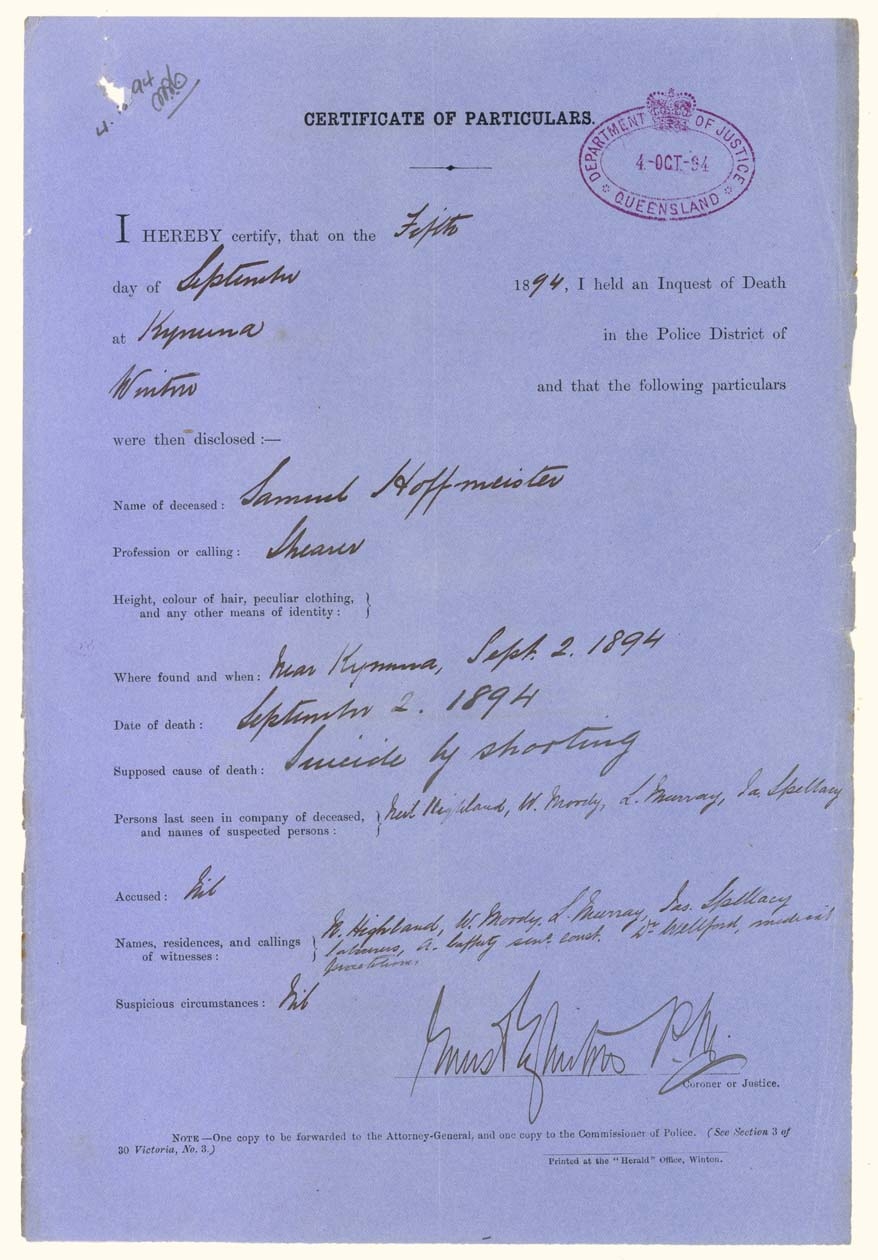 - "Certificate of Particulars" form of the inquest held into the death of Samuel Hoffmeister on 2 September 1894, dated 5 September 1894. Queensland State Archives. Digital Image ID 2812