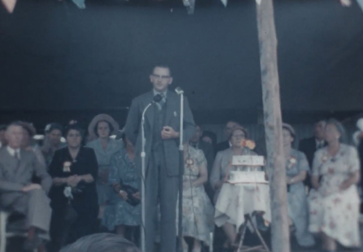 Gordon Chalk, member for Lockyer and future Queensland Premier. Still from Glenore Grove State School 50 year jubilee film (1956), John Oxley Library, State Library of Queensland
